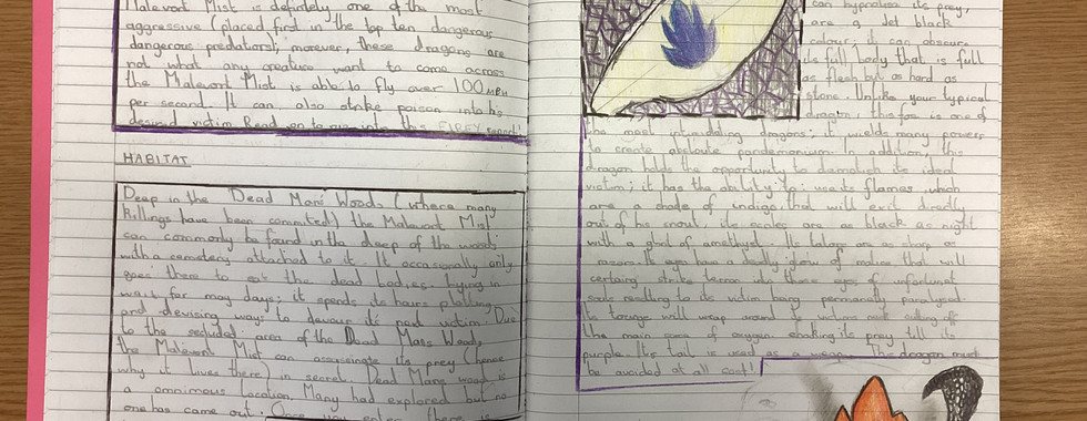 Children in y6 were inspired by the amazing "The Compete Book of Dragons" by Cressida Cowell. They designed and planned their own dragon and wrote non-chronological to inform other people about their amazing predators!